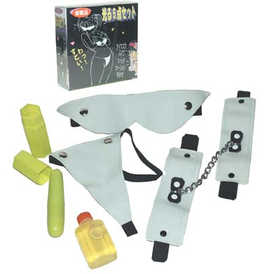 SMグッズのお買い得セット「光る5点セット」!セット内容は「夜光アイマスク・夜光Tバック・夜光手枷・ローター・ミニローション」の5点!暗闇の中でも、責めることの出来る箇所の近く(唇・アソコ・指など)が怪しく光るので、相手の行動はお見通しです!誰でも簡単お手軽にSMプレイを楽しめて嬉しい「脱マンネリ化」グッズ!夜光Tバックを履くとまるで蛍のよう!お尻フリフリして誘ってみてね。SMグッズのお買い得セット「光る5点セット」!