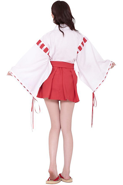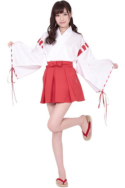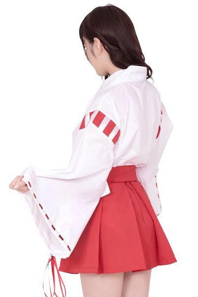 願い事があるなら、まずはお祈りしてね!白着物に赤のパイピングリボンが印象的な、巫女さんのコスチューム。袴風にアレンジされたミニスカートが可愛いらしい巫女さん衣装で、あなたも夢のなかの巫女ちゃまに大変身!