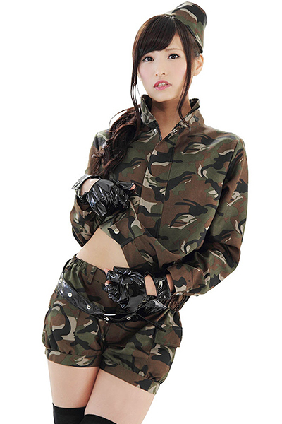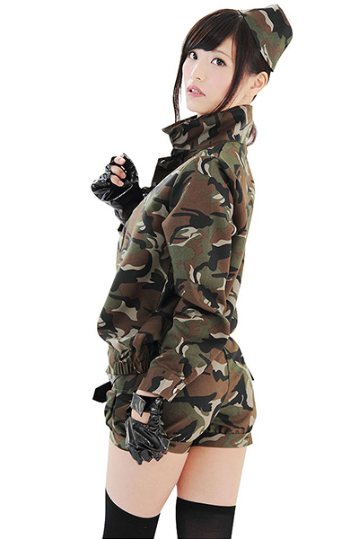 迷彩柄でカモフラージュOK!どこにでも潜入できそうな、アーミーコスプレ衣装です。長袖ブルゾン&膝上パンツに、幅広ベルトをキュッと締めれば、ワイルドでセクシーな女兵士が完成!キャップと指無しグローブ付きのお得なコスプレ衣装です。※靴下は付属しません