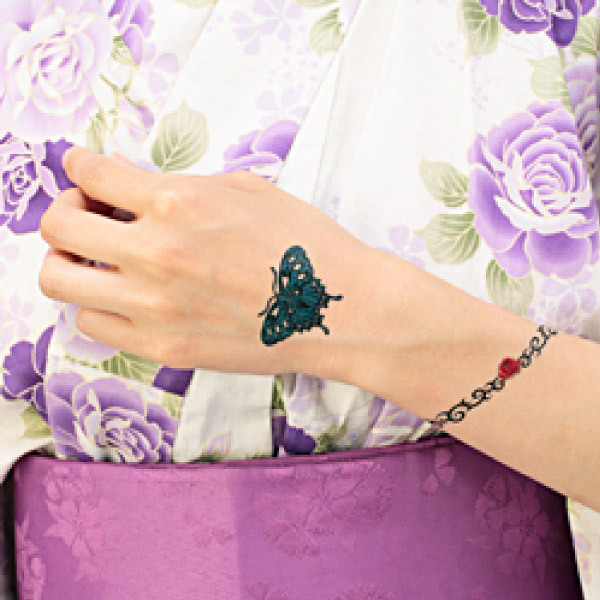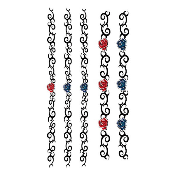 露出の多いコスチュームにぴったり!女性に人気のバラ柄タトゥーシール「腕輪・トライバル薔薇」。皮膚に馴染む特殊素材を使用!水に濡れても剥がれず、2〜3日は保てます。手首や腕にぐるっと一周巻くように貼り付けたり、足首に貼ってアンクレット風にしてもOK!シールを剥がしたい時は、専用リムーバーやクレンジングクリーム等で優しく拭き取って下さい。