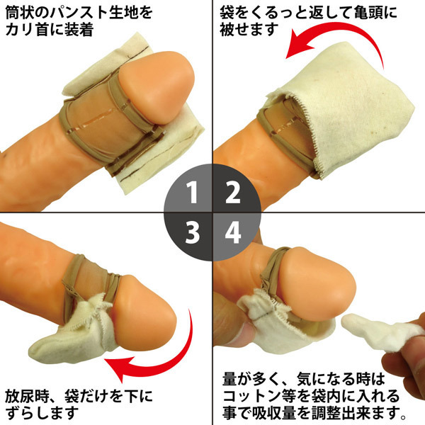 尿漏れによるズボンへのシミ汚れを徹底的にガード!装着タイプの尿漏れ対策用ペニスカバー。●亀頭に直接被せる袋カバータイプ●袋部はお肌に優しいネル生地●装着部は筒状の伸縮ストッキング素材●排尿時は袋をずらすだけの簡単仕様●袋にコットン等を入れれば吸収量もUP●洗浄して繰り返し使用可。もうズボンにシミを作らない!残尿の不安を解消してくれる装着タイプのペニスサポーター。万が一の勃起にも対応できる通気性&伸縮性のあるストッキング素材なので、違和感なく固定が可能です。