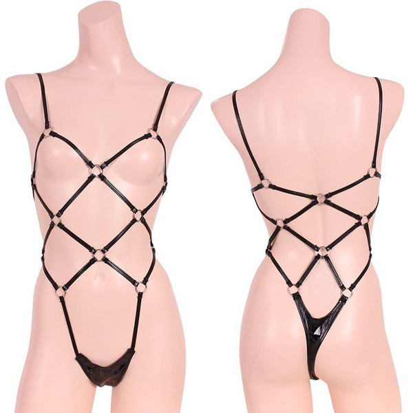 ハードなエナメル×リングで仕上げた亀甲縛りデザイン風!オープンスタイルのプレイスーツコスチューム「エナメル&リング亀甲プレイスーツ ブラック」。エナメル素材をリングでジョイント!肌に食い込むような亀甲縛り風なのでSM好きにもぴったりのアイテム。世界的なUSメーカーブランド『Shirley OF HOLLYWOOD(シャーリーオブハリウッド)』とコラボした『Cherry Love』シリーズです。※モデル153cm・B83・W56・80cm・Fカップ