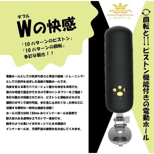 回転しながら超絶怒涛の高速ピストン!机や床に固定できる強力吸盤付き電動オナホール「Luoge Happiness Cup(ルーグ ハピネスカップ)LG-361」。電動ホールとしての気持ちよさとチントレとしての目的を追求!強力吸盤で固定できるので角度を変えることでバリエーション豊かな体位を実現します。各10パターンの回転とピストンの多彩な動きはそれぞれ個別のボタンで操作可能!また、便利な一時停止機能も備えた安心仕様です。インナーホールには柔軟で耐久性のあるクリアなエラストマー素材を使用!触手のような長いイボがギッシリ詰まった内部構造が予測不能な摩擦を生み出します。高級感あふれるスタイリッシュボディでハンズフリーの腰振りオナニーをガンガン楽しめる回転&ピストン機能付きのハイブリッドな電動オナホール。インナーホールは取り外せるので洗浄も楽々!面倒な電池交換の不要なUSB充電式(専用コード付属)です。