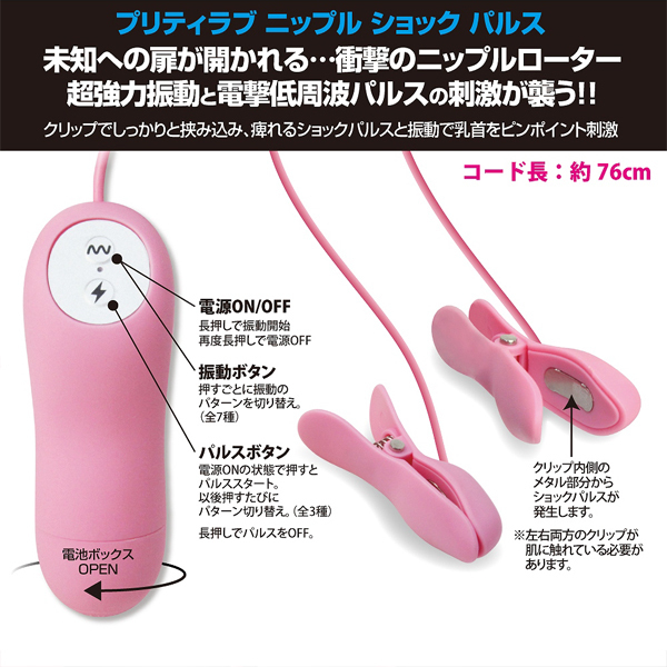 低周波パルス&振動。乳首を挟み込み、超強力振動と電撃低周波パルスの刺激が襲うニップルローター!!電気刺激でビクンビクン収縮させつつ、強烈な振動で乳首をピンポイントで責めまくります。もう振動だけじゃ満足出来ない、クセになる刺激を求める方に長く愛されてきた低周波シリーズ。●3パターンショックパルス●7パターン強力振動