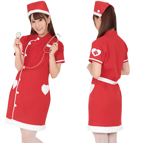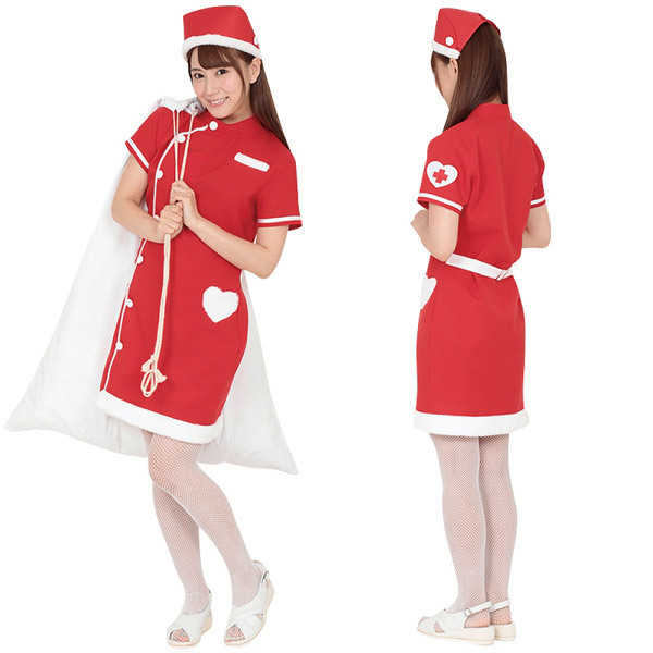 クリスマス・サンタコスチュームの通販サイトならこちら♪白衣の天使も聖なる夜だけはクリスマススタイルに変身!ハートマークがラブリーで可愛いクリスマス衣装。程よい膝上丈ワンピースは、露出控えめな衣装をお探しの方に最適!ワンピースほか、ボンボンサンタ帽とピンの3点セットです!