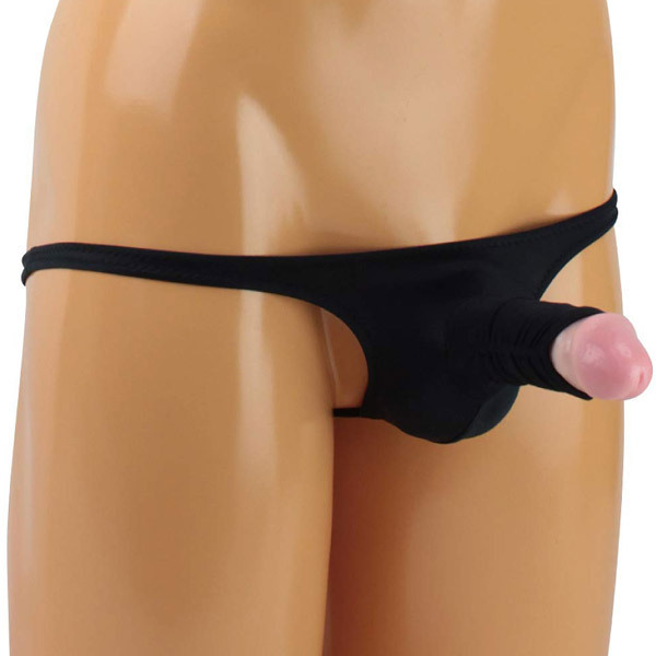 亀頭をチラリと覗かせセクシーにアピールする日本製のVバック(メンズ用)。伸縮性の高いストレッチ生地を採用で穿き心地抜群♪男の象徴をエロティックに魅せつける男性用Vバックです。ブラックカラー、Mサイズ