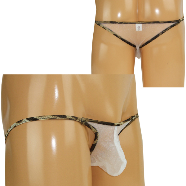 男性の象徴を大胆にアピールしたい小悪魔な男性に!ワイルドなヒョウ柄の日本製ハーフバック(白)。大事な部分やお尻が透けて見えてしまうほどの極薄生地でセクシーに仕上げた一枚♪ここぞという勝負の夜には野性味あふれるヒョウ柄ハーフバックで大胆に攻めてみては?