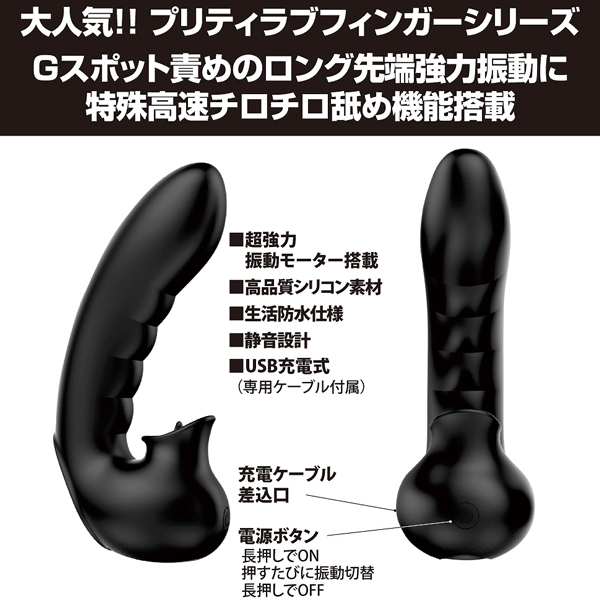 大人気!プリティラブフィンガーシリーズの最新作!Gスポット責めのロング先端強力振動にクリを責める特殊高速チロチロ舐め機能搭載!●12パターン強力振動●3パターン高速舐め●先端に高性能強力モーター搭載●高品質シリコン素材