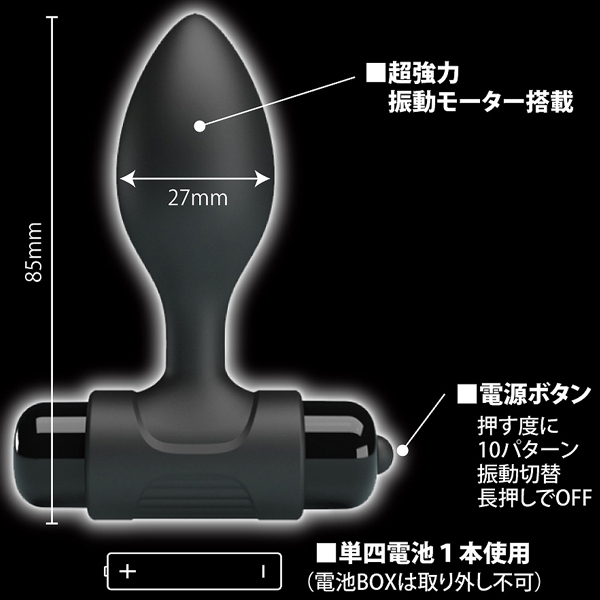先端に内蔵された高性能モーターで奥深くまで強力振動を届ける電池式アナル専用プラグ。10種類もの多彩な振動を搭載!人肌優しい高品質な医療用シリコンを使用したコチラは、程よいサイズ感となめらかな曲線でお尻にツルっと挿入しやすく振動もしっかり味わえるので、初心者さんから上級者の方まで幅広くお楽しみいただけます♪単4電池×1本