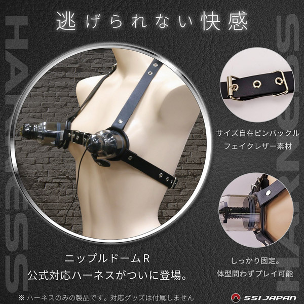 回転刺激を楽しめる乳首責めグッズ「ニップルドームR(b29020)」を乳房で密着固定しハンズフリーで楽しむことのできる専用ハーネス「ラックス」。柔らかな合皮素材の黒ハーネスがニップルドームを胸にしっかり固定!サイズ調整できるピンバックル式で、男女、体型問わず幅広いプレイを可能にします。