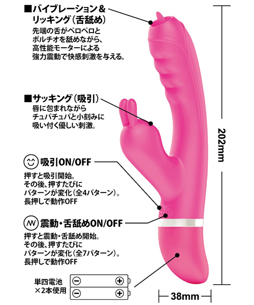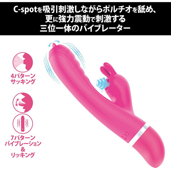女性の一人エッチにピッタリなF型フォルムが使いやすい、クリ吸引機能とバイブレーション機能を備えた2点責めバイブ!Gスポットを震わせるパワフルな振動と、クリに密着して吸引され敏感にしてくれる同時責めはヤミツキ必至!C−spotを吸引刺激しながらポルチオを舐め、更に強力震動で刺激する三位一体のバイブレーター!唇に包まれながらチュパチュパと小刻みに吸い付く優しい刺激。●4パターンサッキング●7パターン振動+リッキング●高品質シリコン●高性能モーター搭載