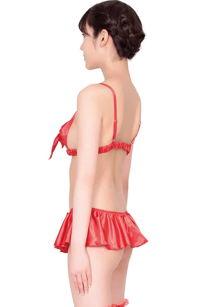 カラダを魅力的に盛りたい時に、絶妙なバランスでボディラインをアピールしてくれる、真っ赤なリボンが大人エレガントなブラセット!柔らかな手触りでふんわりとカップを包み、胸の色気をアップ。スカート一体型のショーツは、Tバックになっていて可愛らしさの中に大人の色気さをプラスしたい方にオススメ
