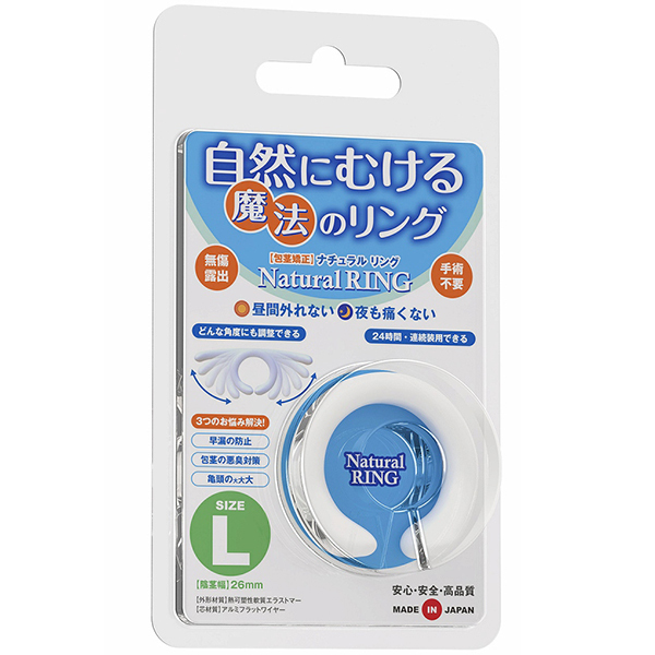自然にムケる魔法の包茎矯正リング!「手術したくない」「自力で解決したい」そんなアナタに最適!清潔さを保ちながらスムーズな「脱皮」「成長」と「コントロール可能な持続力」を実現する魔法のリングです。自由に曲がる絶妙な硬度のフラットワイヤーを内蔵した「自然伸縮構造」により、これまでになかったフィット感を実現したので●昼夜兼用、24時間の連続装用。外れにくいから動きの多い昼間でも安心。Lサイズ