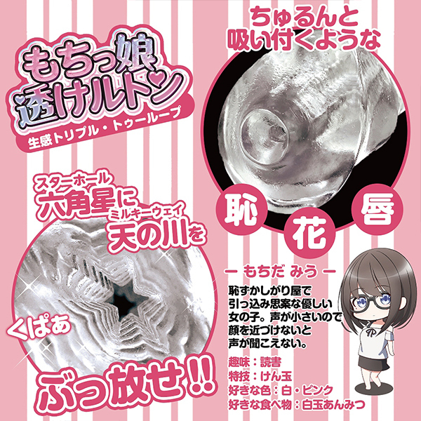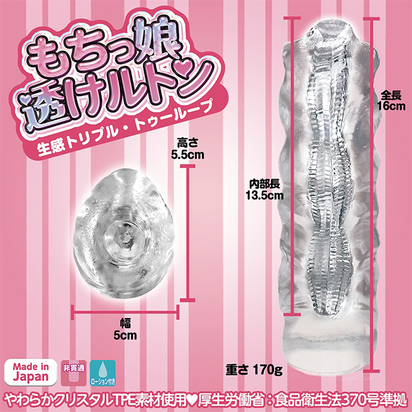 これはまさに透明なオナホ!?クリアな素材なのに柔らかくてモチモチの硬度に設定された非貫通オナホ「もちっ娘透けルトン」の生感トリプル生感トリプル。吸い付くような挿入感と六角星型の穴形にゾリヒダと穴径の緩急、しっかりした射精感も味わえる新感覚のスケルトンオナホです♪六角形のゾリゾリヒダが三連の波を打ち、全長16cmと小ぶりだが、内部の長さが13.5cmあるのでストローク感もしっかり味わえます!重量は170gで細身で筒型なフォルムだから手に馴染みやすく扱いやすいです♪素材はクリアでも固くない日本製の「やわらかクリスタルTPE」を採用しているのでクニャっとなるほどのやわらかさ!オールクリアのボディは入っているところが見えるのでエッチな気分も盛り上げてくれて素材感と相まって心地良いゾリ感が楽しめます。ローション付。