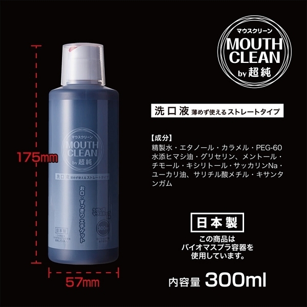 人気の超純シリーズからプレイ前のエチケット商品が登場しました♪薄めずに使えるストレートタイプの洗口液(マウスウォッシュ)で、プレイ前に10〜20mlほど口に含み、約30秒ほど口全体に馴染ませる様にすすぐだけで口の中の嫌な感じを取り除き、さっぱりとした状態でプレイへと臨むことができます。プレイ前のエチケットは男女ともに気をつけたいところ!簡単に使えて便利な超純マウスクリーンで口内が清潔にスッキリとした状態になります。<成分>精製水、エタノール、カラメル、PEG-60水添ヒマシ油、グリセリン、メントール、チモール、キシリトール、サッカリンNa、ユーカリ油、サリチル酸メチル、キサンタンガム