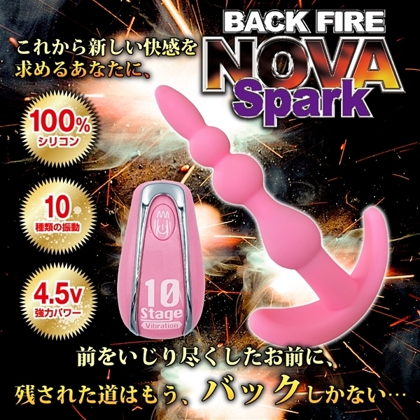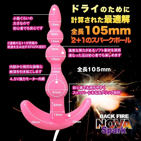 人気のバックファイアシリーズから「バックファイアーNOVA SPARK」が登場♪スパークは座薬の位の大きさの1センチの先端から始まっていき、2連続の15mm&19mmの玉が続き最後は内部にローターを搭載した21mmの玉が待ち構えるという仕様!全部で4箇所の隆起を体験する設計で、1個の玉を通過するたびに、ゾクゾク感と振動が強くなっていき、最後の玉を飲み込んだ時には、まさに脳内でスパーク現象が引き起こされることでしょう!カラーバリエーションはブラックとブルー、ピンクの3色展開でピンクとなります。
