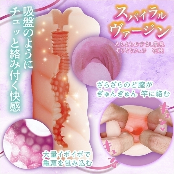 甘酸っぱい魅惑の初体験をイメージした青春オナホール「スパイラルヴァージン」。花純は最近バイト先で気になっていた黒髪美人の後輩。そんな彼女が掛け持ちしていたのは、たまたま入ったちょっぴりえっちなお店ほんのりピンクのぷっくりとした艶やかな唇が、貴方を迎えてくれます。中は、波打つぞりぞりとした入口と、ぴちぴちとした壁がきゅんと締まるのどマン構造。ランダムにある大き目の突起が、通るたびに裏筋へ快感を与えます。