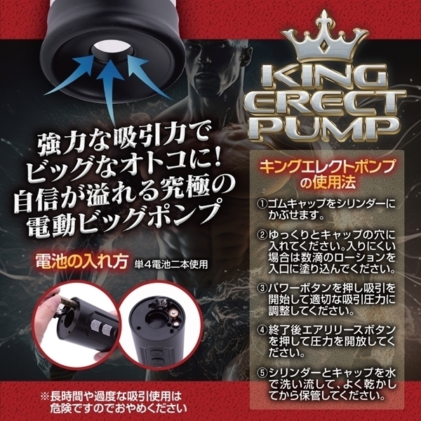 究極吸引力でビッグなオトコに!自身が溢れる究極のビッグポンプ!電動吸引の為、ハイパワーでギンギンのガッチガチ!挿入部はゴムキャップを装着できるので空気が漏れません。電源ボタンはもう一度押すと吸引が止まります。エアリリースボタンもあるので安心してご使用ください。単四電池2本も付属しておりますので購入後すぐにご使用いただけます。