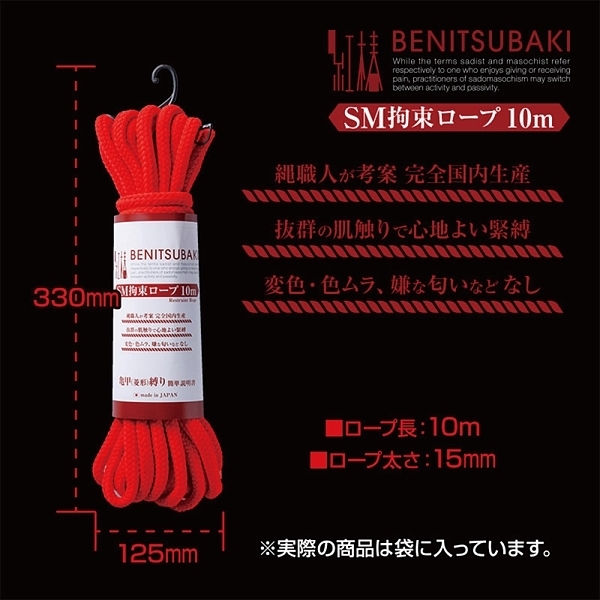 知る人ぞ知る伝説のSM女王・紅椿。このSM拘束ロープは簡単、かつ安全に拘束プレイが楽しめるロープです。程よい柔らかさと弾力感があり、しっかりと肌に馴染む様にできています。この商品には誰でも簡単に亀甲(菱形)縛りができる説明書が付いています。初心者の方でも気軽に本格的な緊縛が楽しめるでしょう。●カラー:赤