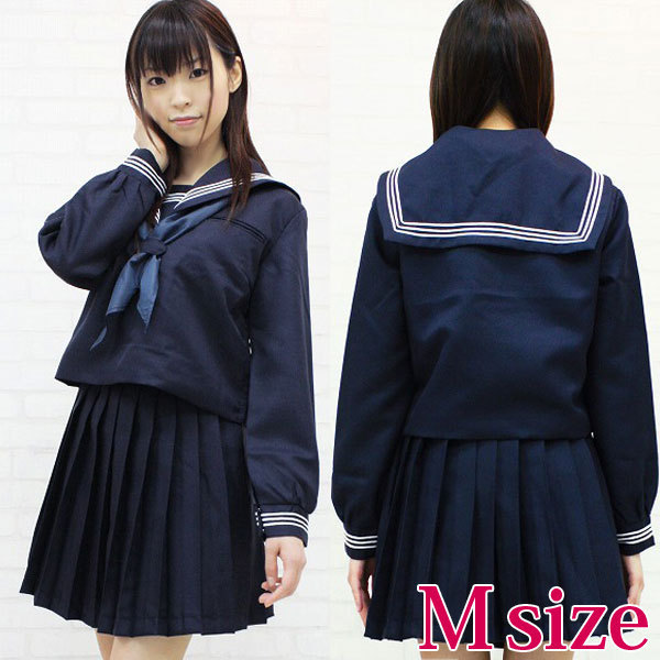 制服コスプレの定番!ネイビーカラーの長袖セーラー服。上着はサイドファスナー仕様、スカートはアジャスター付き、もちろんスカーフもセットです!しっかりとした作りで、クオリティの高いお嬢様系制服コスチュームです。※水洗い不可、塩素系漂白剤による漂白不可、アイロンは中温で当て布使用、ドライクリーニング可、色落ちの可能性があります。※こちらの商品は在庫の状況によりお届けまでに4日〜7日程度かかる場合がございます。