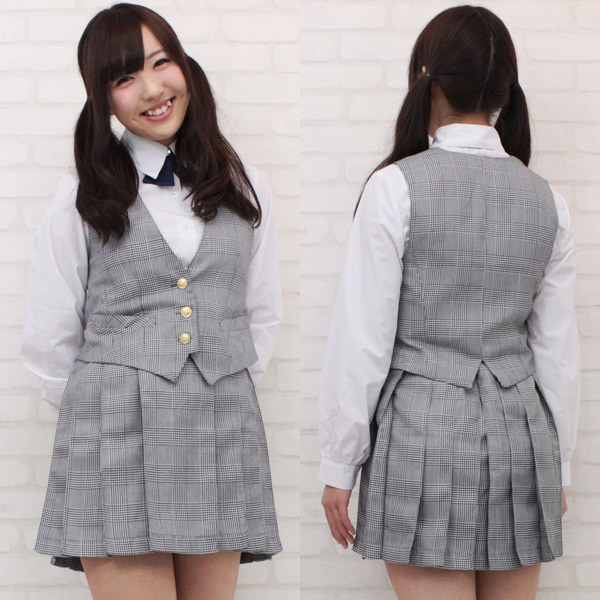 金ボタン付きのベストがポイントになった中間服タイプ!グレーチェックで清楚なお嬢様風に仕上げた制服コスプレ(BIG)。シャツ、スカート、リボンにベストの豪華4点セット!優等生気分が味わえる、お洒落な制服コスチュームです。※水洗い不可、塩素系漂白剤による漂白不可、アイロンは中温で当て布使用、ドライクリーニング可、*色落ちの可能性があります。