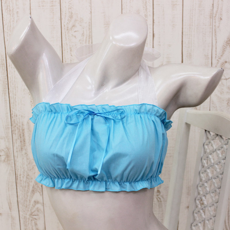 見せブラOK!たっぷりギャザーが超可愛い、水色のチューブブラジャー単品。●女装子さんも着用できるBIGサイズ●ずり落ち防止・白いシフォンリボンを結んでホルターブラにチェンジ●縫いこんだストレッチゴムのおかげでボディにフィット●胸元にキュートな細いリボン飾りをあしらいました。ファッションアレンジが楽しい乙女チックなランジェリーです。※水洗い不可、塩素系漂白剤による漂白不可、アイロンは中温で当て布使用、ドライクリーニング可。※こちらの商品は在庫の状況によりお届けまでに4日〜7日程度かかる場合がございます。