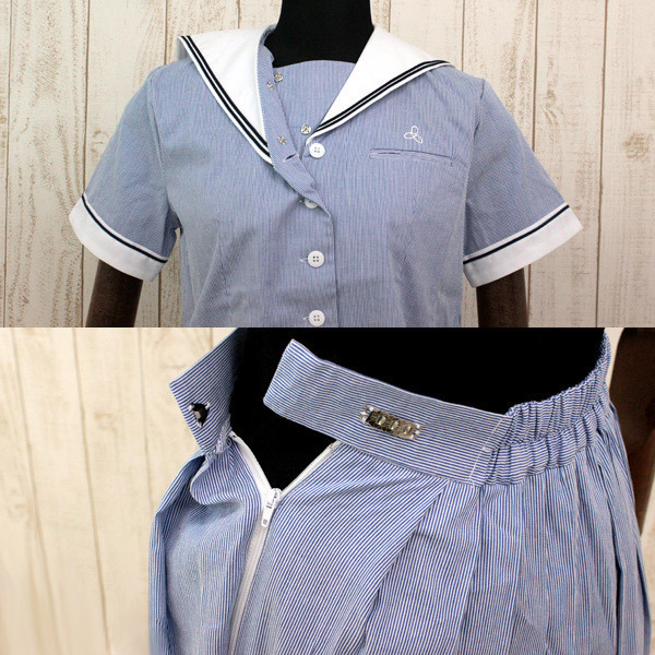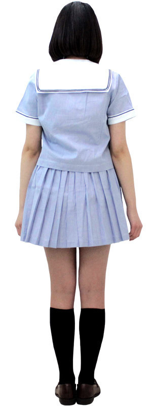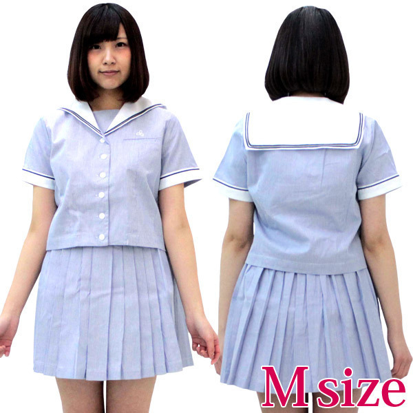 ずっと憧れていたお嬢様学校の生徒気分を満喫できるセーラー服コスプレ(上下セット)。●Mサイズ:B〜95cm・W〜72cmに対応●淡いブルーカラー●トップス:スナップボタン&前開きボタン留め(胸ポケットあり)●セーラー襟&半袖にライン入り(夏制服タイプ)●プリーツスカート:サイドファスナー&3段ホック留め。ウエストの一部にゴムが入っているので多少のサイズ調節が可能です。※水洗い不可、塩素系漂白剤による漂白不可、アイロンは中温で当て布使用、ドライクリーニング可、色落ちの可能性があります。