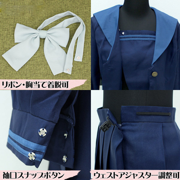 学生らしいさわやかなブルー系♪襟の色が特徴的な人気の旧冬服セーラー服(Mサイズ)。紺無地のセーラーブラウスとプリーツスカートに、ブルーグリーンのリボンがポイントの制服コスプレ。胸当てとリボンはスナップボタンで着脱可能です。※水洗い不可、塩素系漂白剤による漂白不可、アイロンは中温で当て布使用、ドライクリーニング可、色落ちの可能性があります。
