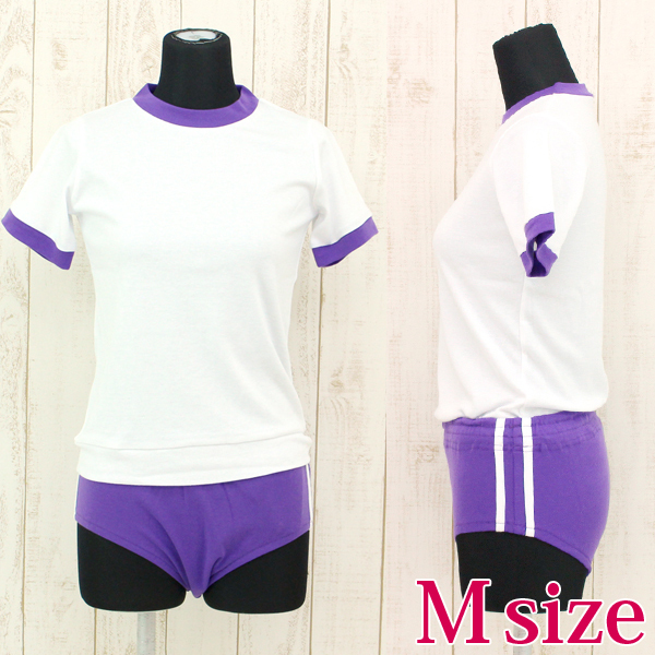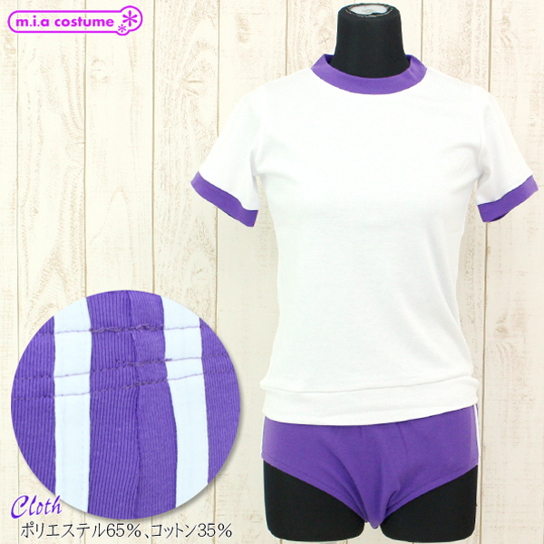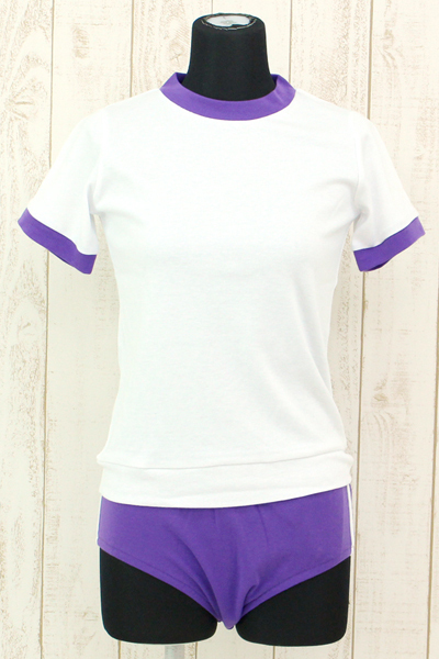 深めの紫ブルマに2本の白ラインを施した白トップスとの上下セット。シンプルな体操着にパープルカラーを取り入れた可愛い体操服コスプレ♪このほかにも様々なカラーバリエーションをそろえておりますので、そちらも是非あわせてご覧くださいませ。※手洗い可、塩素系漂白剤による漂白不可、アイロンは中温で当て布使用、ドライクリーニング可、色落ちの可能性があります。※こちらの商品は在庫の状況によりお届けまでに4日〜7日程度かかる場合がございます。