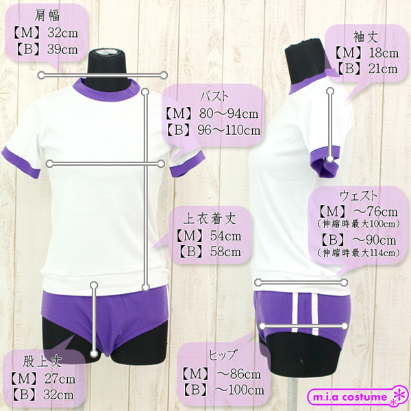 Mサイズ B80〜94cm・W〜76cm(伸縮時最大100cm)・H〜86cm 上衣:着丈54cm・肩幅32cm・袖丈18cm ブルマ:股上丈27cm セット内容:上衣、ブルマ 素材:ポリエステル65%、コットン35%