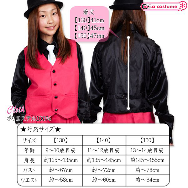 130サイズ 対応サイズ:身長125〜135cm・B〜67cm・W〜58cm 実寸:着丈41cm セット内容:ベスト単品(前ボタン) 素材:ポリエステル100%