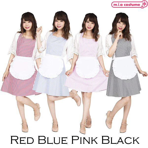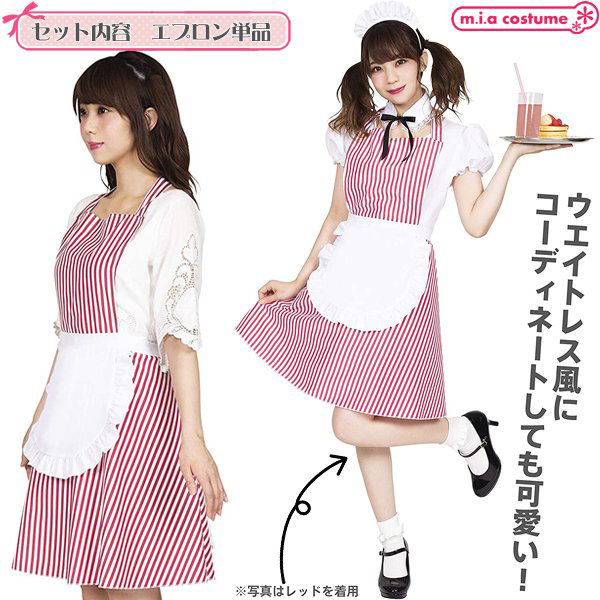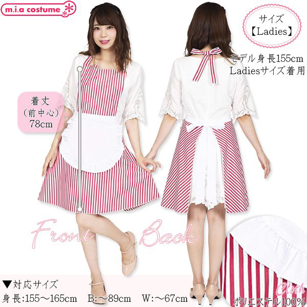 細めのストライプ柄が印象的で、とっても大人かわいいエプロンです。ウエストの白いフリルエプロンは一体型になっていて、首と腰でリボン結びするタイプだから体型にあわせてサイズの調整が可能です♪キッチンだけでなく、お料理教室やプレゼントとして、ホームパーティーなどにも!アメリカンダイナーやウェイトレス風にもコーディネート出来るので、学園祭、カフェイベントでの使用にもおすすめです!※洗濯機不可、弱い手洗い可、塩素系漂白剤による漂白不可、アイロンは中温で当て布使用、ドライクリーニング不可