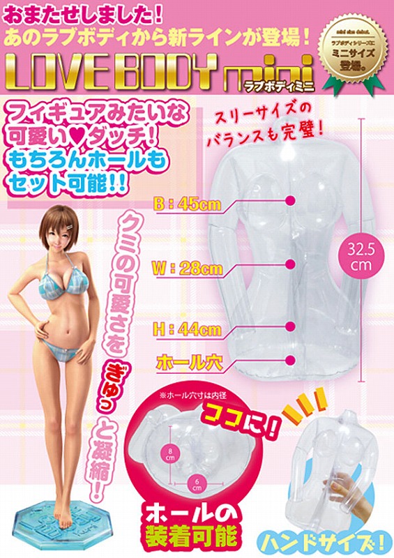 絶大な人気を誇るエアーダッチLOVEBODYシリーズから、コンパクトな「mini」が登場!全長32.5cmとサイズはコンパクトでも、ラブボディのクオリティはそのまま!美しいkumiのスリーサイズバランスを、ぎゅっと凝縮したパーフェクトボディです。もちろんホールの装着も可能ですので、お気に入りオナホールの固定用としてご使用下さい。