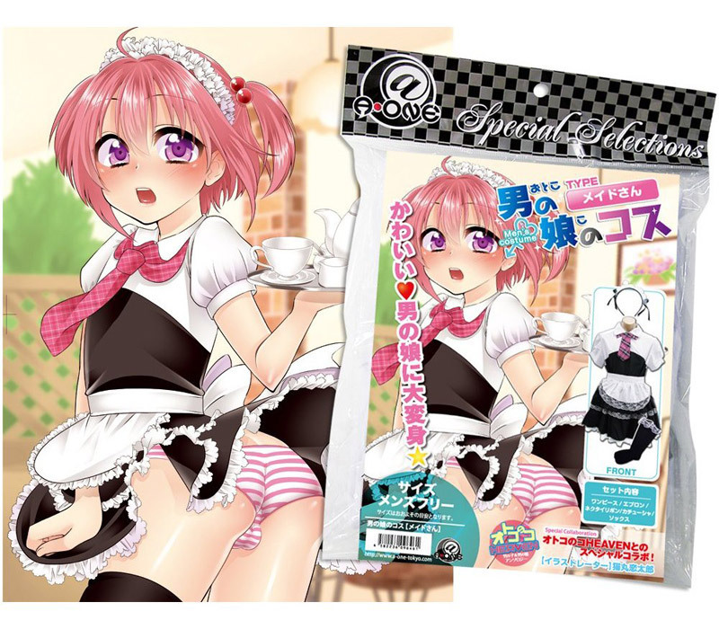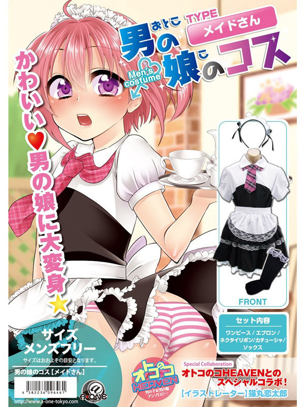 男の娘待望、メンズフリーサイズ!桃色ネクタイが超可愛い、メイド服コスチューム。レース飾りがお洒落なシャツ一体型ワンピース、フリルエプロン、チェックのネクタイ、サイドリボン付きカチューシャ、黒ハイソックスの豪華5点セット!憧れのメイドさんになれちゃう、セクシーコスチュームです。