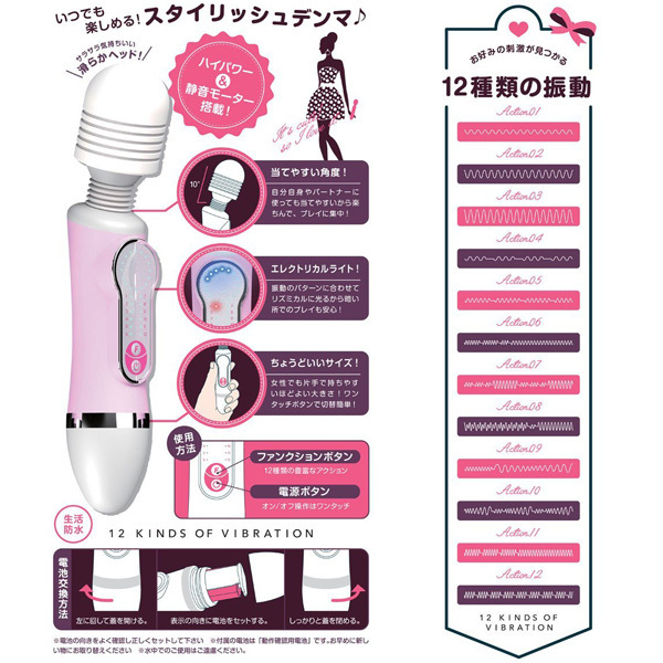 ソフトからハイパワー振動まで自在!キュートカラーの電池式ハンディサイズ電マ。●お肌に優しい滑らか素材ヘッド●当てやすい10度の角度付き●モーター最大回転14000rpm●12種類の振動アクション搭載●ワンボタンの簡単操作●振動パターンと連動するライト●静音&生活防水仕様。女性でも持ちやすく疲れにくい程よいサイズの電動マッサージャー!ヘッドに角度がついているので、自分で使ってもパートナーに使っても快感ポイントをしっかり狙えます。