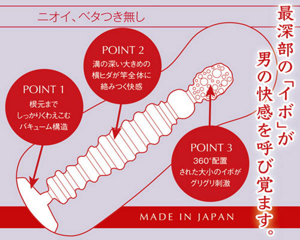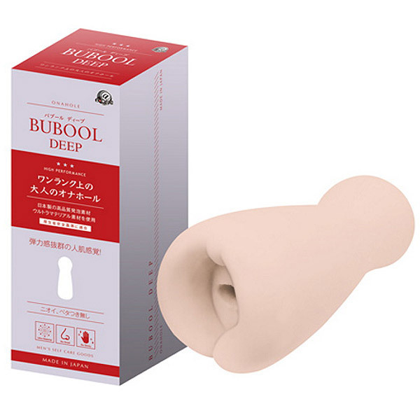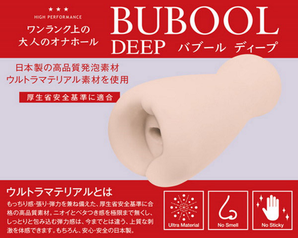 厚生労働省安全基準に合格の高品質の純国産素材「ウルトラマテリアル」を使用したことでニオイとベタつき感を極限まで無くし、しっとりと包み込む弾力感を実現。今までとは違う上質な感触をご体感いただけます。また、気泡によるクッション性が、人肌以上の弾力感を生み出しました。最深部の「イボ」が男の快感を呼び覚ます「バブール ディープ」根元までしっかりくわえ込むバキューム構造に加え、溝の深い大き目の横ヒダが竿全体に絡みつき快感を与えます。さらに最深部では360°配置された大小のイボ群が亀頭全体をグリグリと刺激します。付属ローションからホールまで、すべてが日本製。ワンランク上の大人のオナホールで最高のひと時をお楽しみください。