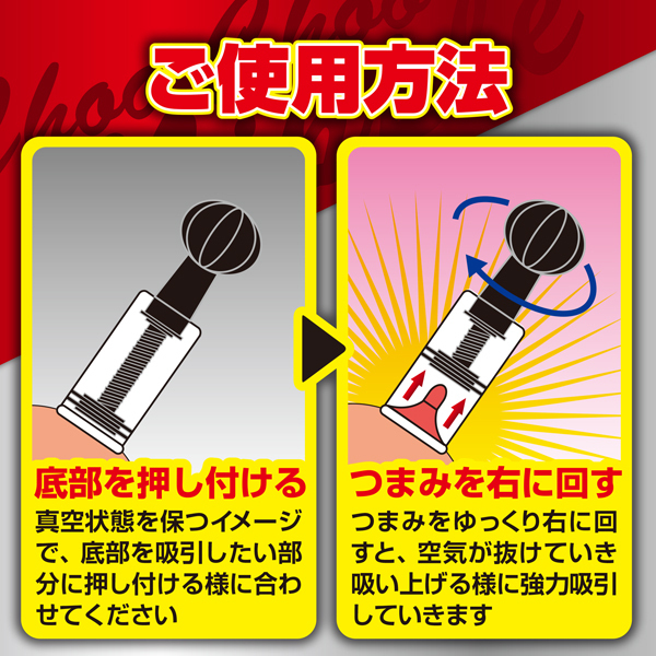 超絶バキュームッ!!超強力吸引で乳首調教!吸う快感&吸われる快感をアナタに。つまみをくるくる回すだけという簡単な使用方法で、乳首をギュインギュインと吸っていきます。真空状態を保つイメージで底部を吸引したい部分に押し当て、つまみをゆっくり右に回すことで強力吸引!皮膚にしっかりと密着するように、ローションなどを使うとさらに快感度もアップ!乳首だけでなく、アイデア次第でいろんな吸引調教を楽しんで♪サイズ違い、AとBの2タイプ同時発売!