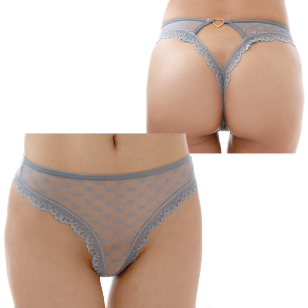 ラブリーなハート模様を控えめに魅せるデザインがポイント!グレー系のカラーメッシュ素材の透け見える感じで大人っぽさもあるTバックショーツ。ベースとなるメッシュ生地には小さなハート柄が入っていて、トリミングのレース使いや、深めのレッグカットが美脚なシルエットも演出してくれるショーツです♪フロントはやや大人しめなデザインですが、バックにはダイヤ型のカットアウトが入っており、トップにはゴールドのハートモチーフがアクセッぽくキラリと輝いて視線を惹きつけます!※刺繍などのデザインが異なる場合がございます。濡れたままの保管は色移りの原因になります。