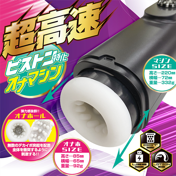 超高速!!ピストン特化オナマシン!!Dr.シコ美が寝る間を惜しんで開発した「爆シコピストン」が遂に誕生!!マッハ級のピストンで高速刺激!ハンドホールでは体験不可能な高速ピストンで、一気に絶頂まであなたを導く。弾力感抜群の専用ホールは、内部に無数のデカイボを配置し、全体に衝突するように刺激。シンプルで使いやすい操作性だから、一心不乱にプレイできる。ホールは簡単に取り出せるのでメンテナンスもらくらく。短期戦を制し速ヌキ速射!!爆シコでキメろ!!充電時間:約180分/連続使用時間:約60分(使用状況や環境により時間が変わる場合があります)。【シコ美STORY】刺激とは?射精とは?マスターベーションに関して、日々自問自答しながら発明を続けるシコ美。そんなシコ美が寝る間も惜しんで作ったオナマシーンが遂に完成!!あなたは被験者第1号となり、最後の一滴まで搾りとられる事となる!?