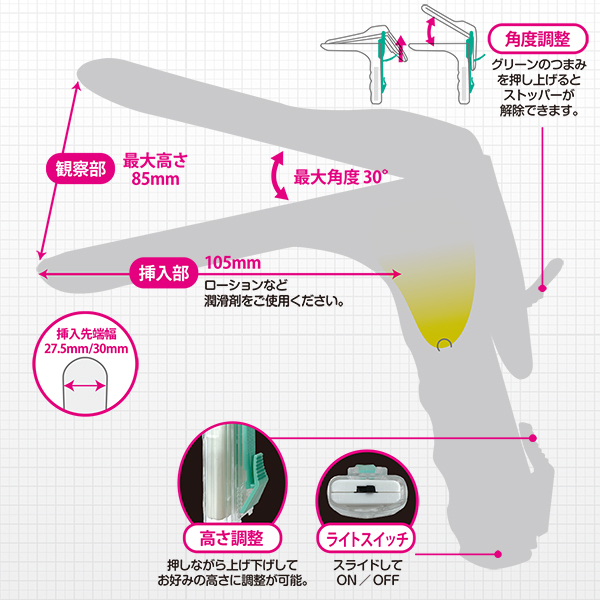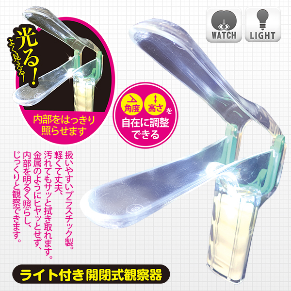 医療プレイがリーズナブルに愉しめる!恥ずかしい内部をじっくり観察できるプラスチックビークに、なんとライト付きが登場!ヒヤッとしないプラスチック製で角度と高さを自在に調整可能。ライトは横にスライドするだけの簡単スイッチ。アソコの中はもちろんのこと、おクチの中など、様々な箇所を明るく照らし観察できます。プラスチック製なので汚れてもサッと拭き取れます。※挿入の際はローションなど潤滑剤を十分に塗ったうえでお使いください。※電池の交換はできません。