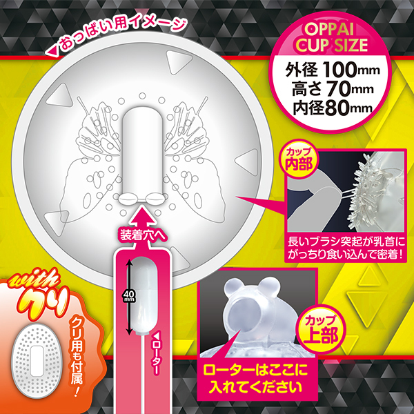 ローターが外せるからもっと自由に楽しめる!使い方はとっても簡単!!カップ上部分の穴にローターを入れ、おっぱいに吸着させるだけ!おっぱい全体をガッチリホールドできるおっぱい用カップ。内部のブラシ突起は乳輪&乳首をしっかり刺激!振動は悶絶必至の10パターン。好みのパターンでガンガン乳首イキしちゃおう。クリ用のカップも付属しているので3点責めもOK!!カップに装着せずそのままローターだけでも、1人でも2人でも責めても責められても存分に楽しめる乳首グッズです♪■充電時間:約60分/連続使用時間:約40分※使用状況や環境により時間が変わる場合があります。10振動・エラストマー製・USB充電式コントローラー