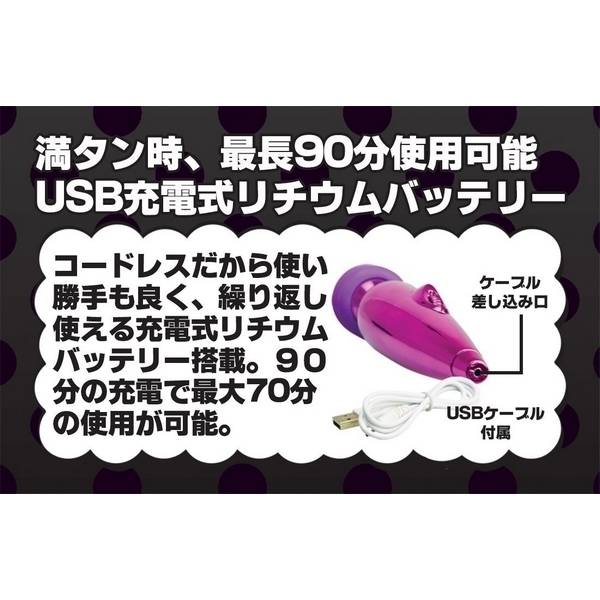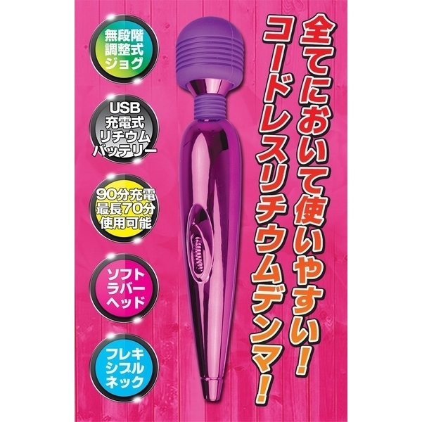 大定番の電マ、遂に極まる…!ハイパワーモーターのUSB充電式ハンディデンマ。●メタリックなパープルボディ●片手でも楽々ハンディサイズ●コードレスで使い勝手も抜群●15000回転の高性能モーター●優しいソフト製ラバーヘッド●柔軟なフレキシブルネック●無段階調整式ジョグダイヤル●充電90分で最大70分使用可。全てにおいて極まった最強デンマが登場!ハイパワーなリチウムバッテリーが実現した驚きの振動力を持つハンディ電マ。片手で持ちやすいサイズ感とコードレスならではの取り回しの良さ、そして電池式よりも優れた軽さも魅力です。
