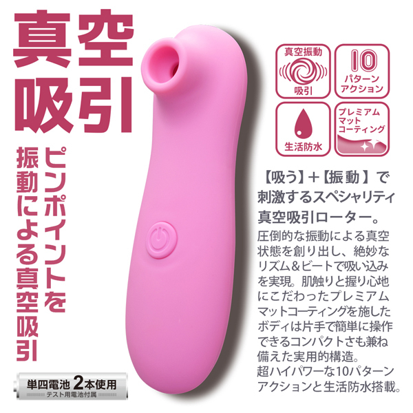 女性の敏感なポイントを真空吸引!バキューム×振動で刺激する電池式の吸引型ローター(ピンク)。超強力10パターンのアクションを搭載!リズミカルな振動を加えて真空状態を作り出すことで女性の敏感な部分を強力バキューム♪肌触り良く握り心地も良いプレミアムマットコーティングを施した、持ち運びに便利なコンパクトサイズの吸引ローターです。生活防水仕様、単4電池×2本を使用