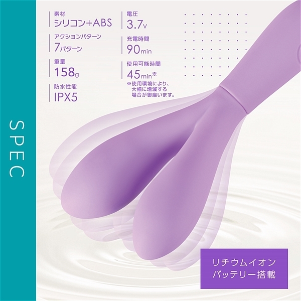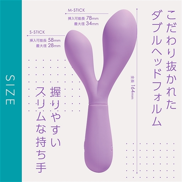 大小、サイズの異なる二つの挿入部が配置されたスティックバイブです。高品質なシリコン素材に上質な振動を演出する高性能モーターをそれぞれに搭載して、挟んだり、自分に合ったサイズを挿入してお楽しみ頂けます。IPX5の防水性能だからしっかり洗えて衛生的に何度も使用可能です。3.7Vリチウムイオンバッテリー搭載で90分で満充電、最大45分の連続使用が可能です(使用環境により大幅に増減します)。多彩で実用的な7パターン振動アクション。色んな楽しみ方が出来る高性能プレジャーグッズです。●カラー:パープル