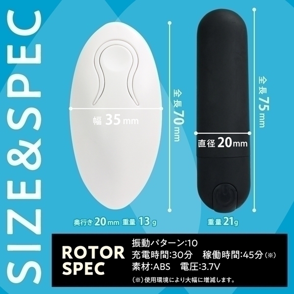 コンパクトながら高性能なワイヤレスローターです♪直径約20mm、全長約75mmの超小型サイズで、どこへでも手軽に持ち運べます!なめらかなマット素材を使用し、心地よい触り心地を実現♪高性能マイクロモーターによる力強い振動を、10種類のパターンから自由に選べます!静音設計なので、周囲を気にせず安心して使用できるのもポイント♪IPX7対応の高い防水性能で、水に浸けても問題なく使えます!使用後も丸洗いできるため、清潔に保つことができます♪30分の充電で、最大約45分の連続使用が可能!(使用状況により変動します!)水場でも遠距離でも活躍する、頼れるワイヤレス設計です♪