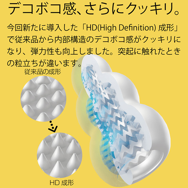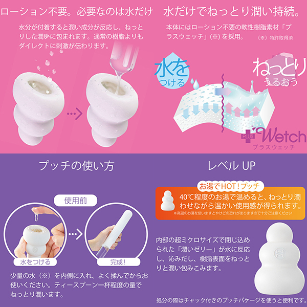 全てが新しくなったプッチ。ポケットサイズのローション不要ホールプッチシリーズが生まれ変わって新登場。軟性素材から内部の構造、パッケージ、全てが新しくなりました。デコボコ感、さらにクッキリ。今回新たに導入した「HD(High Definition)成形」で突起のデコボコ感がさらにクッキリになりました。突起に触れたときの粒立ちが違います。弾力感、さらにモッチリ。「HD 成形」により軟性樹脂の弾力性も向上。さらにモッチモチに、しなやかな素材になりました。内部構造も、さらにハッキリ。オリジナルシリーズ、スイーツシリーズ計8種類の内部構造をより精密な造形にリニューアル。「HD 成形」とあいまってデコボコ感がよりハッキリわかる構造になりました。生産工場を一新。新型プッチシリーズは日本国内に新設した工場から生産。最新の設備と厳密な品質管理で一つ一つ丁寧に作ります。ローション不要、必要なのは水だけ。ローション不要軟性素材「プラスウェッチ」水分が付着すると潤い成分が反応、ねっとりした潤いに包まれます。<クリーム内部構造>「吸い込まれるトルネード構造」斜めに擦り上げてくるヒダはクリームのように昇りつめる絶頂感