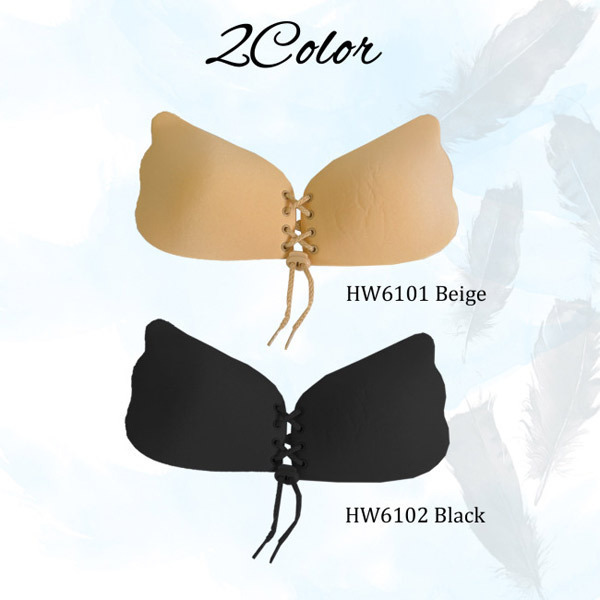 寄せて上げて谷間もメイク♪天使の羽型シリコンブラ「フェザーアップブラ ブラックA」。羽のようなカップがボディに馴染みやすいブラックカラーのモールドブラ!カップ内側は粘着シリコン樹脂、外側はサラリとした肌触りのポリエステル素材です。中央はアジャスターで自在に調整できる編み上げ仕様!胸のボリュームを強調したい場合は少し上目で着用し、紐を持って留め具を上下させるだけで自由に谷間をメイク出来ます。【着用方法】両手でカップを外に向けて反らし、最適な位置にあわせてから外に反ったカップを胸の方向に戻して、ふちが胸につくように指先でなぞって下さい。左右着用後、両手でカップをしっかり押さえて定着させ、留め具をスライドしてお好みで調整して下さい。粘着効果が薄れた際は、一度水洗いし乾燥させてから再度着用して下さい。※サイズは画像を参考にお選びください※通常よりワンサイズ小さめが綺麗に着用できる目安です※Bサイズ(h00037)もございます