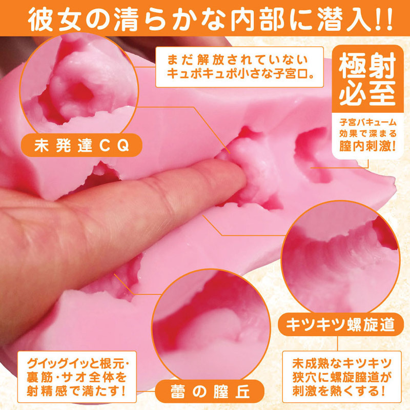 「ロリCQ」は、キツキツの子宮(CQ)を再現したオナホールで、キツキツのCQが好きな方におすすめです♪挿入直後に未発達の膣丘が感じられ、内部でしっかりと締めつけてくれます。奥に進むと、未成熟なキツキツ狭穴に螺旋膣道が刺激的な快感を与えます!サイズは平均的なハンドホールと同程度で、ボリュームも300gほどの肉厚さがあり、素材はバンジータッチで、べたつきやにおいはありません♪肉厚で柔らかい弾力が特徴です。最深部手前には小さな未解放の子宮口があり、最深部にはバキューム効果を持つエアポケットを採用!しっかりと締めつけて強力なバキュームで吸い上げてくれるため、最後の一滴まで快感を存分に味わえます。未経験の少女への挿入感をたっぷりと楽しんでください♪