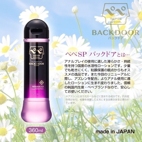 アナラー待望の逸品!幅広く愛用されているペペスペシャルシリーズに、超特濃アナルローション「ペペスペシャル バックドア」が登場!特殊製法により実現した濃度と特殊成分で、長時間潤いが持続!従来のクオリティはもちろんそのまま!こってり濃厚な使用感のアナル用ローションに仕上がっています。こちらはたっぷりお使い頂ける360ml入りです。