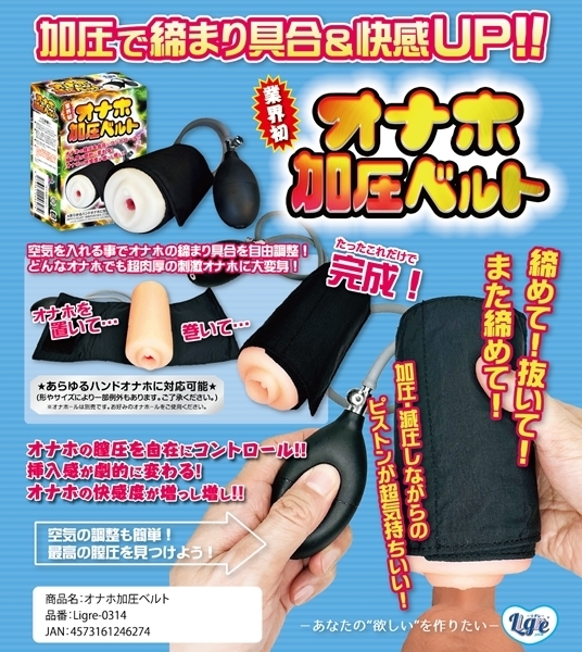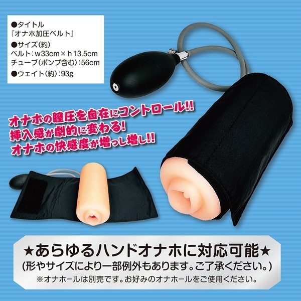 お使いのオナホに巻くだけで締まり具合を自在に調整できるサポートグッズです♪ベルトを巻いて空気を入れるだけの簡単操作で、内部に圧をかけられます!加圧することで挿入感が変化し、刺激の質を自分好みにカスタマイズできます♪スカスカに感じていたオナホも、締まりのある肉厚仕様に変身します!すでに満足していたオナホも、加圧によってさらに快適な使用感が得られます♪空気の出し入れもワンタッチで簡単に操作可能です!多くのハンドタイプオナホに対応する巻き幅で、汎用性も抜群です♪挿入・加圧・解放のサイクルを繰り返すことでトレーニングとしても使用できます!本体は軽量で扱いやすく、収納や持ち運びにも便利な仕様です♪自分だけの締まりポイントを見つけて、新しいオナホ体験を楽しみましょう♪※ご使用時は加圧しすぎにご注意ください!